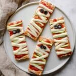For Halloween parties, I’ve arranged several mummy pizzas on a dark platter lined with parchment, adding little plastic spiders and cobweb decorations around the edges for a festive vibe. They also look adorable served on mini wooden boards for individual servings — everyone feels special!