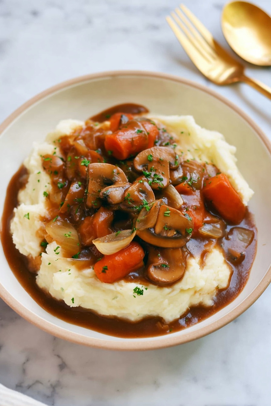 While the stew simmers, whisk together the flour with water until completely smooth—this slurry is the secret to that luscious, gravy-like texture. Pour it into the pot and stir continuously to avoid lumps. Then, return the browned mushrooms to the pot, cover, and let it simmer for another 15 minutes. Keep an eye on it and stir occasionally to prevent sticking. What you’re left with is a thick, deeply flavored vegetarian stew that’s perfect spooned over creamy mashed potatoes.