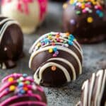 - Dip the Truffles: Dip each chilled truffle into your choice of melted chocolate, then place back onto the parchment paper. Decorate with sprinkles or extra drizzles of chocolate if desired.