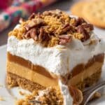 For special occasions, I’ve served this No Bake Pumpkin Lush in individual clear glasses to show off the distinct layers. It’s such a crowd-pleaser and takes minimal effort. I also like to press the crust mixture into mini muffin tins for bite-sized pumpkin lush cups—perfect for parties.
