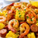 - Garnish and serve: Garnish the shrimp boil with additional chopped parsley and lemon wedges. Sprinkle additional seafood seasoning to taste if desired. Serve immediately with the reserved butter sauce.