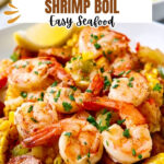 A flavorful Old Bay Shrimp Boil featuring jumbo shrimp, smoky sausage, sweet corn, and tender red potatoes simmered in a seasoned broth and tossed in a garlic butter sauce for a classic seafood feast.