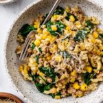 A hearty and flavorful one-pot meal featuring mild Italian chicken sausage, tender orzo pasta, sweet corn, and fresh spinach, all simmered together and finished with parmesan cheese for a comforting dinner.