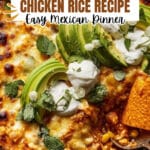 - Serve: Serve the dish hot, topped with plain Greek yogurt, avocado slices, fresh baby basil or chopped cilantro, chopped scallions, and lime wedges for squeezing. Enjoy your flavorful one-skillet Mexican chicken and rice!