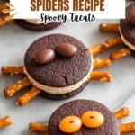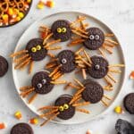 Delightful and spooky Oreo Spiders made with peanut butter Oreos, dark chocolate, pretzel legs, and Reese’s Pieces eyes. Perfect for Halloween parties or fun themed treats that are easy to assemble and sure to impress kids and adults alike.