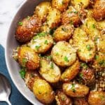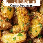 Right before serving, I scatter fresh parsley over the top to brighten the dish and add a fresh herbal note that really balances the richness of the cheese. Then it’s time to dig in—these Parmesan Roasted Fingerling Potatoes are best enjoyed hot, straight from the oven, crunchy, cheesy, and totally satisfying.