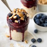 - Finish and Serve: In the morning, swirl in the jelly to create the classic peanut butter and jelly flavor. Optionally, top with extra peanut butter, chopped peanuts, or fresh berries for added texture and taste. Enjoy immediately.