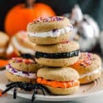 For Halloween, I once arranged these Pumpkin Sandwich Cookies in a “spider web” shape on a serving tray, piping thin white frosting lines over the black frosted cookies. It was a fun hit with my friends! You can also wrap individual cookies in clear cello bags with ribbon for gifts or party favors.