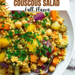 A vibrant and hearty Roasted Pumpkin Couscous Salad featuring a medley of spiced roasted vegetables and tender pearl couscous. This versatile dish can be enjoyed hot or cold, making it perfect for any season or meal. Packed with wholesome ingredients like chickpeas, broccoli, and a blend of spices, it offers both flavor and nutrition in every bite.