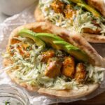- Warm Pitas and Assemble: Warm the pitas in the microwave until soft and pliable. Stuff each pita with a generous portion of the herby ranch slaw, baked chicken pieces, and cubed ripe avocado.