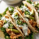 These Shredded Chicken Tacos with Creamy Chimichurri Sauce are a vibrant and flavorful meal featuring tender seasoned chicken, a zesty homemade chimichurri sauce, and fresh toppings. Perfectly cooked chicken is combined with sautéed jalapenos and onions, then layered with crisp romaine, creamy avocado, and tangy feta in warm flour tortillas for a satisfying and delicious taco experience.