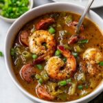 A rich and flavorful Shrimp and Sausage Gumbo featuring a caramel-colored roux, andouille sausage, shrimp, okra, and classic Cajun seasonings simmered to perfection in a savory broth. This hearty dish is perfect for a comforting dinner and is gluten-free and paleo-adaptable.