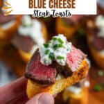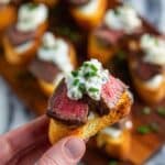 - Assemble Toasts: On each toasted baguette slice, sprinkle a little blue cheese, add a slice of steak, then top with a spoonful of the horseradish sauce. Garnish with extra chives if desired.