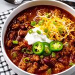 - Serve with toppings: Once cooked, ladle the chili into bowls and add optional toppings such as shredded cheddar cheese, sliced green onions, chopped red onion, sliced jalapeno peppers, and sour cream according to preference.