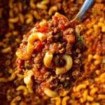 Slumgullion is a hearty, comforting one-pot meal featuring ground beef, macaroni, and a rich tomato-based sauce infused with Italian seasoning and paprika, topped with melted cheddar cheese. This classic American dish is perfect for a satisfying dinner that combines protein, pasta, and vegetables in a flavorful, easy-to-make casserole.