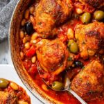 Spanish Chicken in Bravas Sauce is a flavorful and hearty dish featuring tender chicken thighs simmered in a smoky paprika and tomato sauce with olives and white beans. Perfectly baked to meld the rich flavors, this dish brings a traditional taste of Spain to your table and pairs wonderfully with rice.