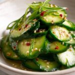 A refreshing and spicy cucumber salad featuring mini or Persian cucumbers, tossed in a flavorful dressing of soy sauce, rice vinegar, sesame oil, honey, garlic, and chili flakes. Perfect as a light side dish or appetizer with an Asian flair.