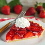 A delicious and refreshing Strawberry Slab Pie featuring a buttery shortbread crust topped with a sweet, thickened strawberry filling made from fresh strawberries and strawberry jello, finished with whipped cream for a perfect summer dessert.