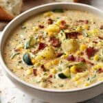 A hearty and creamy Summer Corn and Zucchini Chowder packed with fresh seasonal vegetables, smoky bacon, and comforting spices, perfect for a warm weather meal.