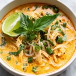 This Easy Thai Chicken Curry Soup is a flavorful and comforting dish featuring a rich blend of Thai red curry paste, coconut milk, and fresh herbs, combined with tender shredded chicken and rice noodles. Perfect for a quick weeknight meal, this soup brings vibrant Thai flavors into a simple, satisfying bowl.