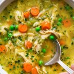 - Shred chicken and add remaining ingredients: Remove the chicken from the pot and place on a cutting board to cool slightly. Shred or cut into bite-sized pieces. Return the chicken to the pot along with frozen peas (if using) and fresh parsley. Simmer for an additional 5 minutes until the peas are bright green and tender.