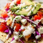 While your fish is frying, shred the purple cabbage finely, dice the roma tomatoes and onions, chop cilantro, and slice avocados. Having all your toppings ready to go means no scrambling once the fish comes out. I love using a sharp knife or mandoline to get thin, even cabbage slices that add great crunch.