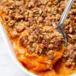 I usually cover leftovers tightly with foil or plastic wrap and store them in the fridge. The sweet potato filling holds up beautifully, though the crisp pecan topping softens overnight — still tasty, but not crunchy.