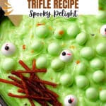 A spooky and festive Witches Brew Halloween Trifle combining layers of chocolate cake, pistachio pudding, cherry cream cheese mixture, whipped cream, and playful candy toppings for a fun and eerie dessert perfect for Halloween parties.